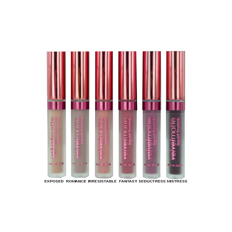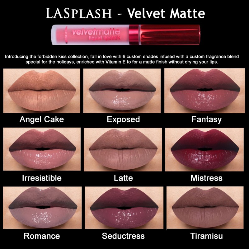 Kolekcija Forbidden Kiss linije LA Splash Velvet Matte šmink vključuje 6 individualnih odtenkov z dodanim vitaminom E, ki omogoča žameten matte finish brez izsuševanja ustnic.
